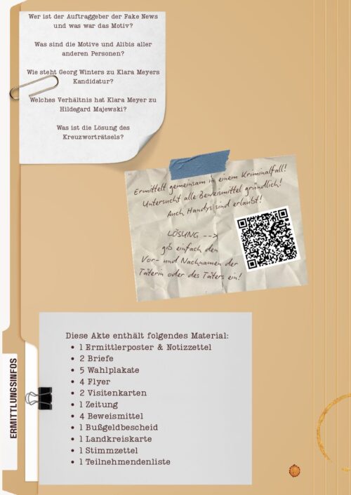 Ihr betreibt ein Detektivbüro und habt es mit einem rätselhaften Fall zu tun: Klara Meyer, engagiertes Mitglied der Lokalpolitik, wurde Opfer der Verbreitung von Fake News. Ihr bekommt alle Beweise, die bisher gesammelt wurden – jetzt liegt es an euch Licht ins Dunkel zu bringen! Beantwortet werden sollen die Fragen, die auf dem Deckblatt der Akte angegeben sind.