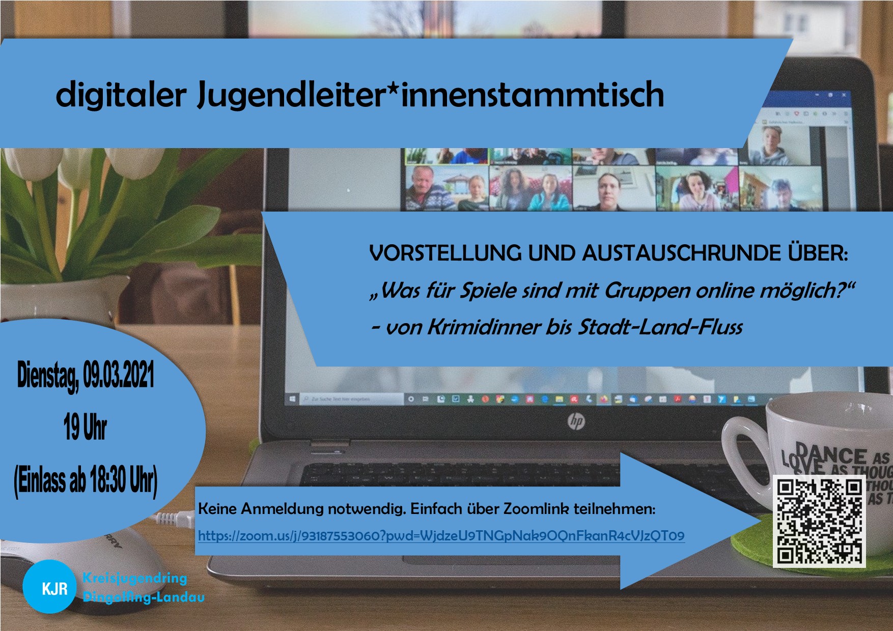Ein weiterer Jugendleiter*innenstammtisch zum Austausch von inhaltlichen Angeboten für die Gruppenstunden ist am 09.03.2021 um 19 Uhr wieder über die Plattform „zoom“ geplant. Hier wird Kerstin Dietzinger, Geschäftsführerin des KJR, eine Übersicht zu nützlichen Links für Angebote, die man in der Gruppenstunde online durchführen kann, geben. Neben aufwendigeren Angeboten, wie zum Beispiel ein Krimidinner, werden auch kurze Spiele, die leicht und ohne großen Aufwand durchzuführen sind, vorgestellt. Teilnehmen kann jede*r Jugendleiter*in und Interessierte ohne Anmeldung über den Zoomlink: https://zoom.us/j/93187553060?pwd=WjdzeU9TNGpNak9OQnFkanR4cVJzQT09
