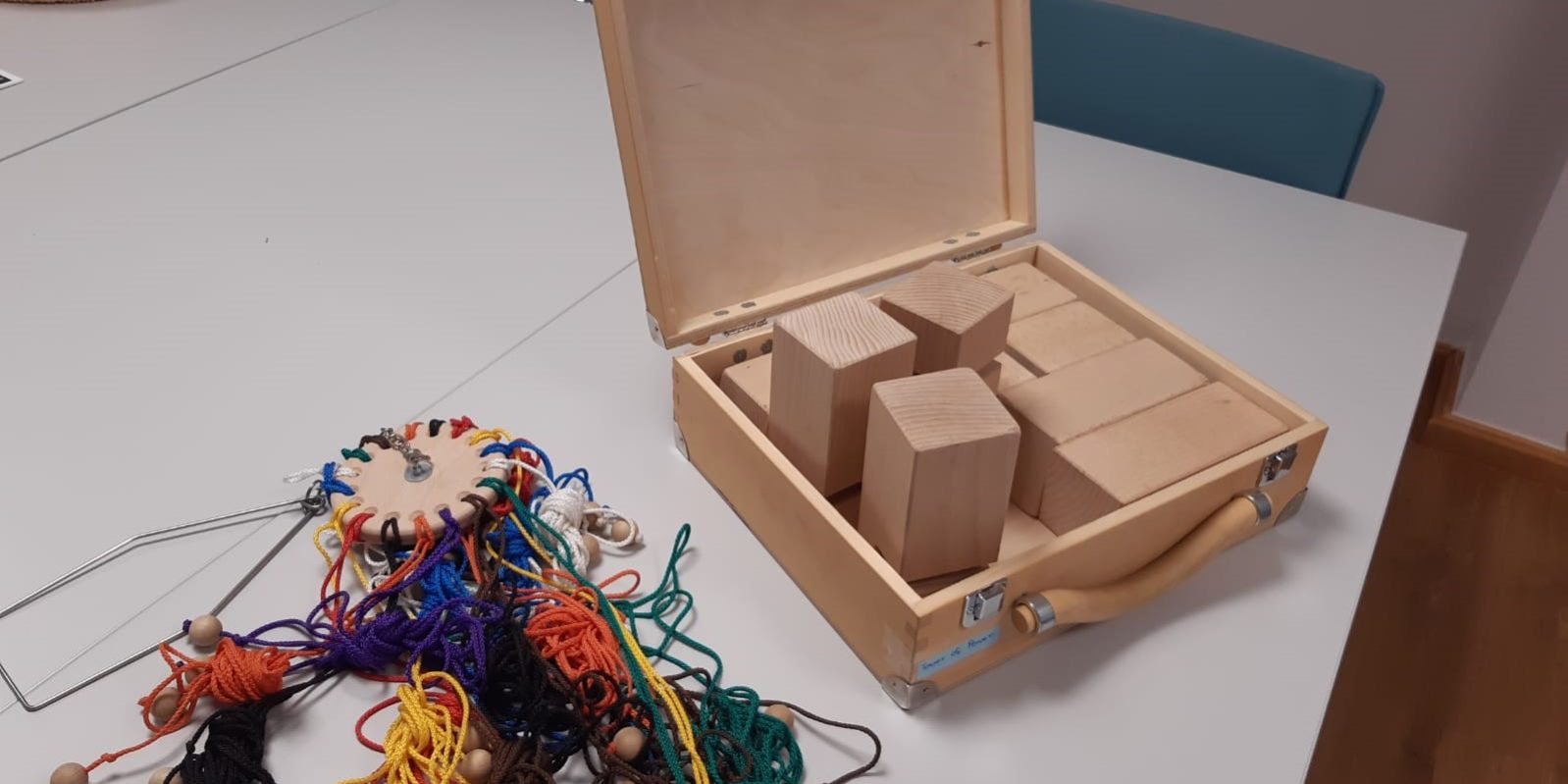 - Im Team müssen wir nur mit Hilfe von Schnüren und Haken einen Turm errichten. Doch Achtung die Bauteile sind schief und nicht alle passen aufeinander.