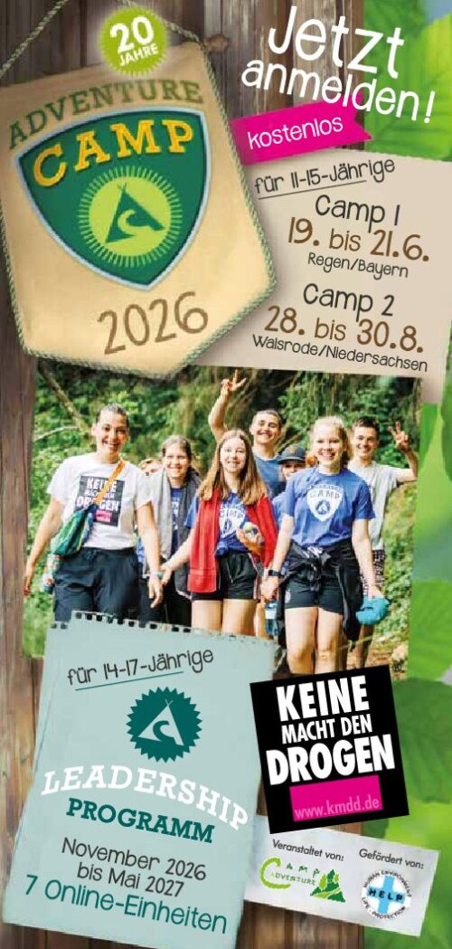 Keine Macht den Drogen e. V. veranstaltet auch dieses Jahr wieder zwei kostenlose Adventure Camps. Jugendliche zwischen 11 und 15 Jahren können sich ab sofort hierfür online anmelden.